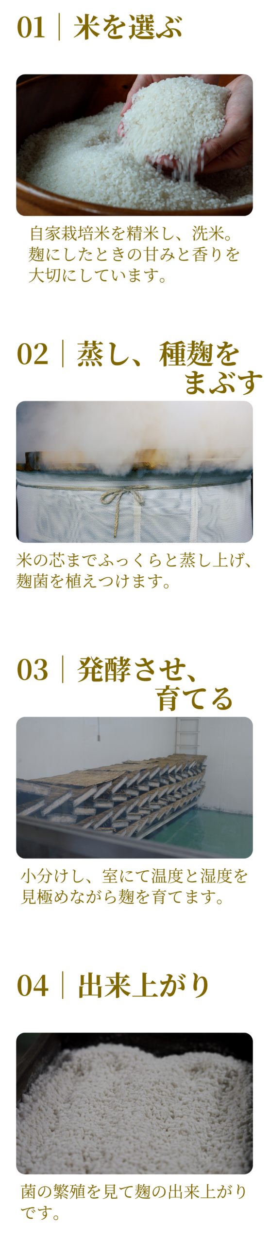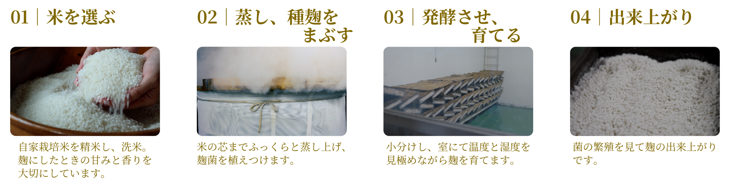 大量生産は行わず、米の状態、気温、湿度と向き合いながら、人の手で、麹を育てています。